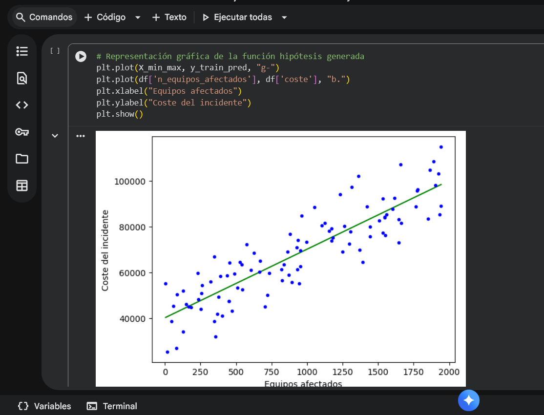 Este ejercicio implementa un flujo básico de Machine Learning en Google Colab para estimar el coste (económico) asociado a un incidente de seguridad en función del número de equipos afectados. El objetivo es ilustrar conceptos clave de regresión lineal, visualización y uso de librerías estándar (numpy, pandas, scikit-learn) en un caso de ciberseguridad.